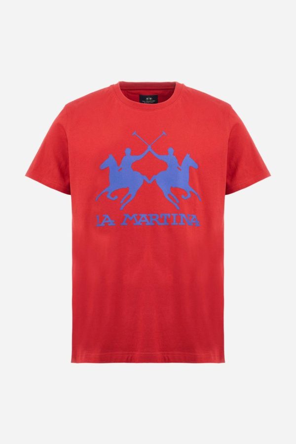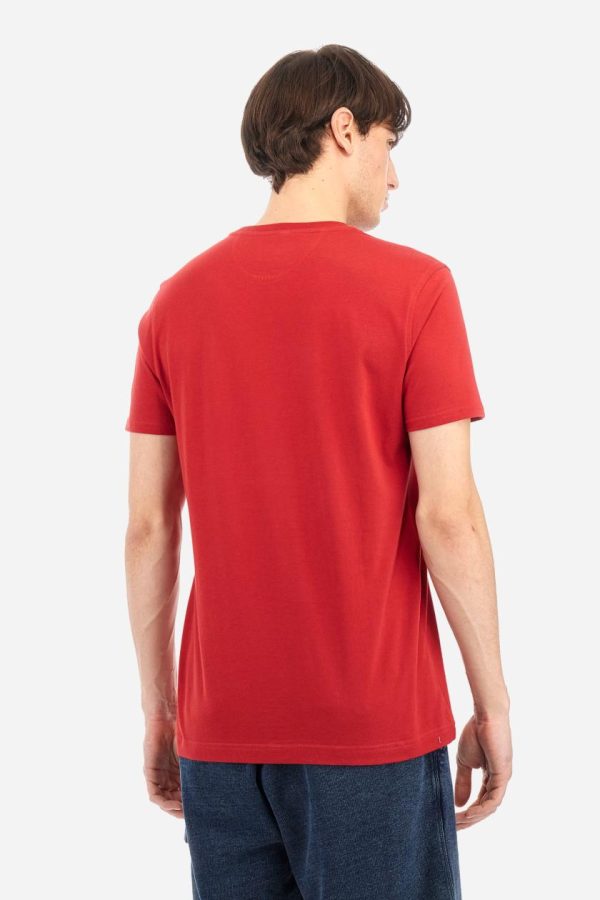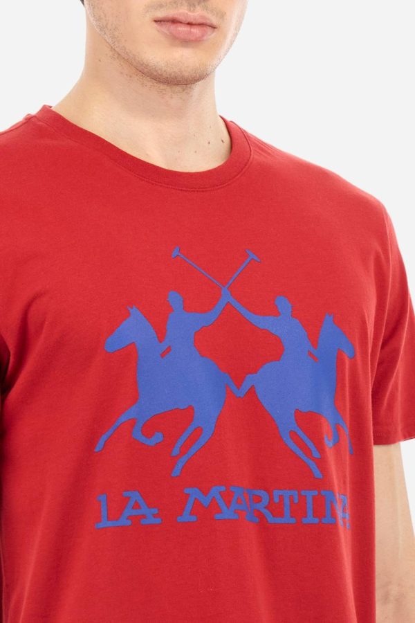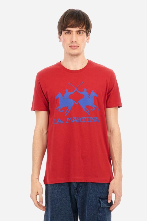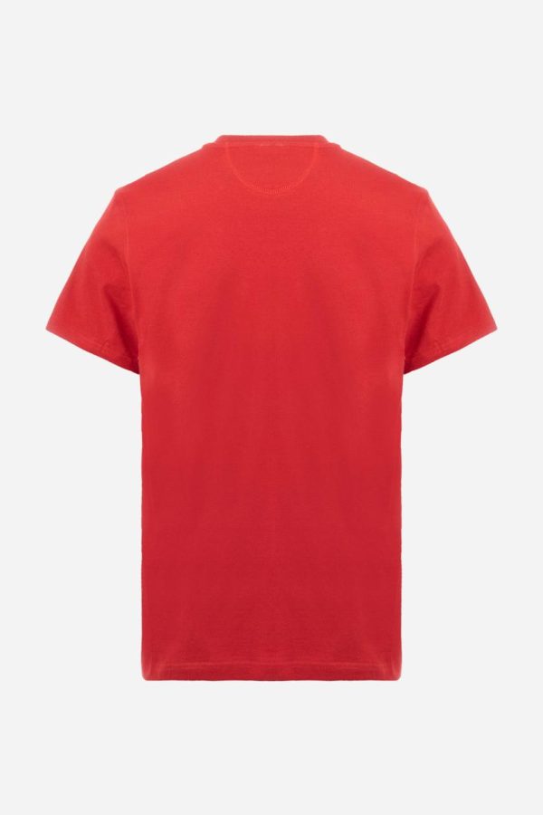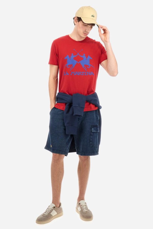 Men’s short-sleeved T-shirt with crew neck and solid colour. It features a large printed logo on the front and is made of 100% cotton with a regular fit. It can be combined with trousers for a casual and modern look. The model is 187 cm tall and wears a size L.