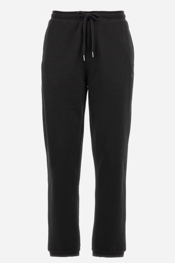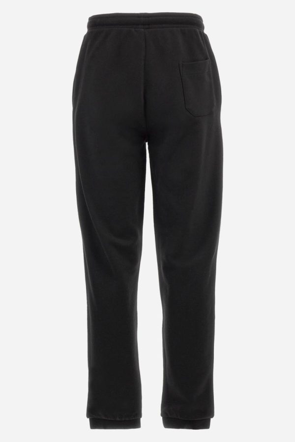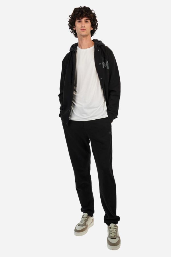 Single-colour men’s jogging trousers in a French terry cotton sweat fabric. Removable and adjustable waistband with drawstring. American pockets at the sides. An additional patch pocket is applied on the back. The logo is embroidered in a colour-contrasting thread on the front, left side. The fit is regular. The model is wearing a size L.