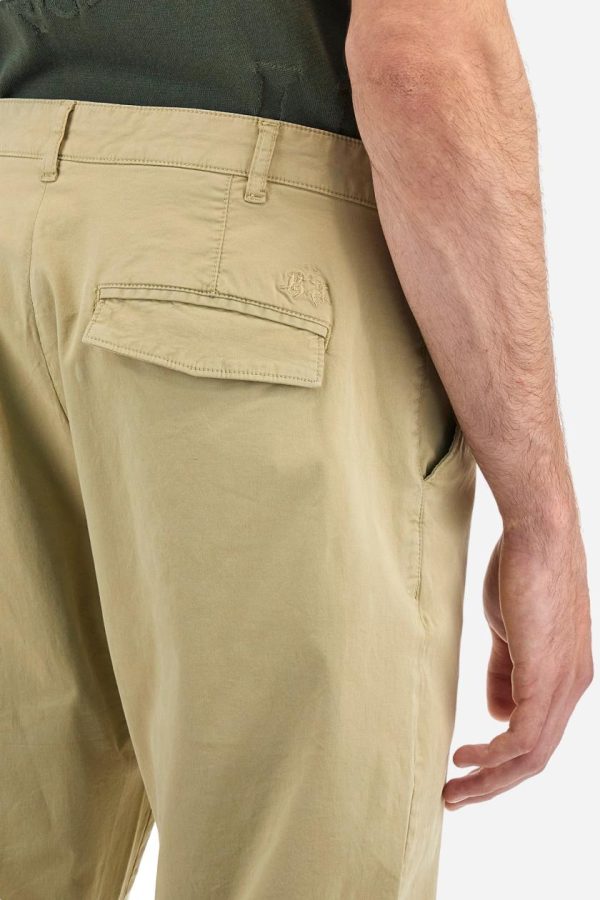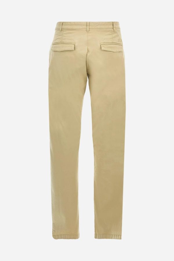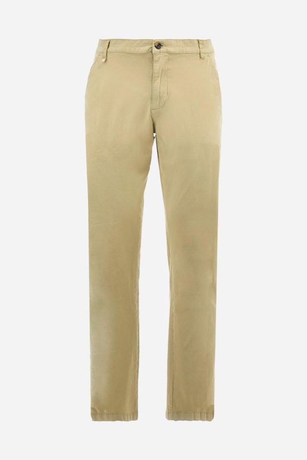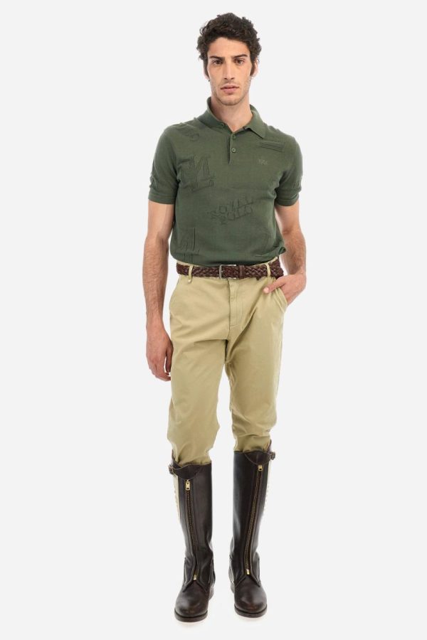Single-colour men’s chino trousers made of elasticated cotton twill. Zip fastening and faux horn button. Side slash pockets and folded waistband. On the back there are welt pockets with a flap and hidden button. The right front loop has a metal rivet with the flag of Argentina as an applied detail. Regular fit. The model is wearing a size 33.