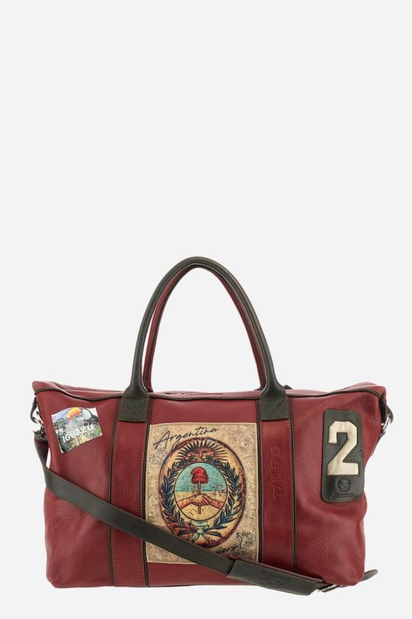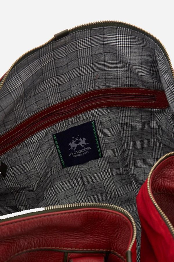 Premium unisex duffel bag in a sophisticated solid color, crafted from genuine 100% leather. This iconic designer piece features exquisite detailing with contrasting elements and premium hardware. Secure zip closure provides reliable protection for your belongings. Designed for versatile carrying with two comfortable handles and a convenient removable shoulder strap. The front proudly displays the distinguished La Martina branding and logo. Each bag showcases handcrafted stitched patches that celebrate Argentina’s rich heritage through artistic landscapes and symbolic motifs. Includes a premium leather address tag attached to one handle for personalized identification. Dimensions (width x height x depth): 64x42x23 cm.