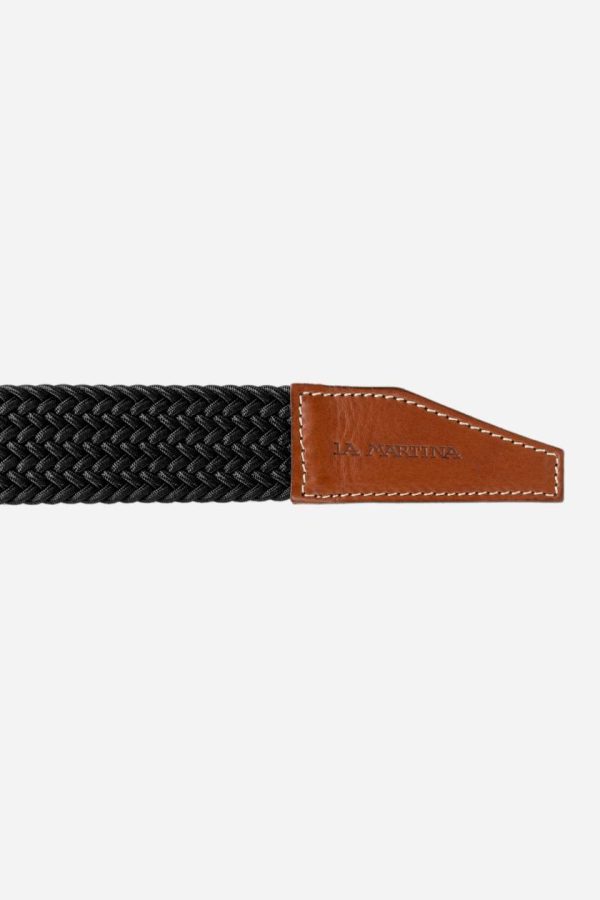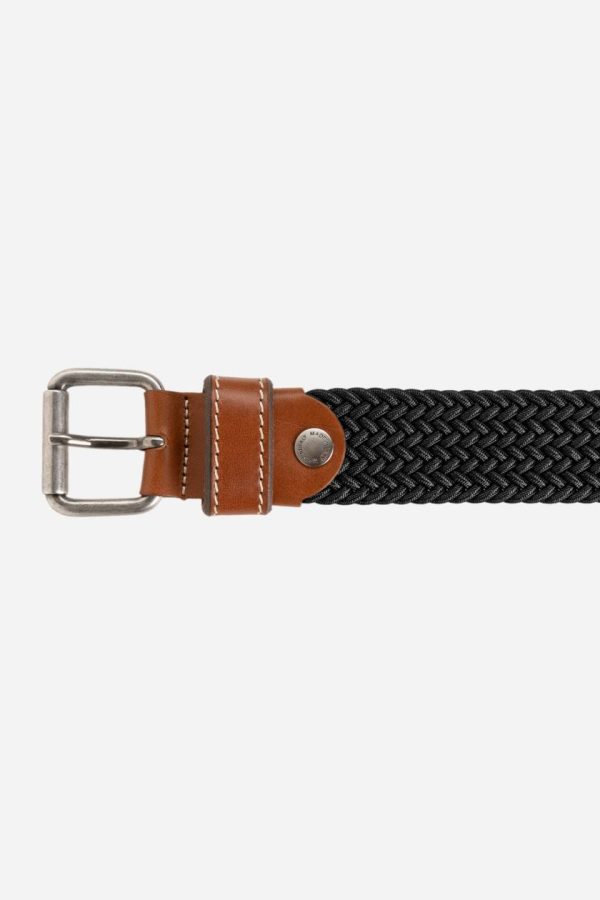 Men’s belt made from cotton and viscose. Woven texture. The brand logo is hot stamped on the leather tip.