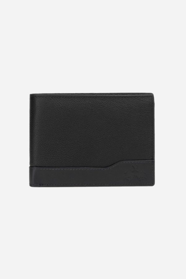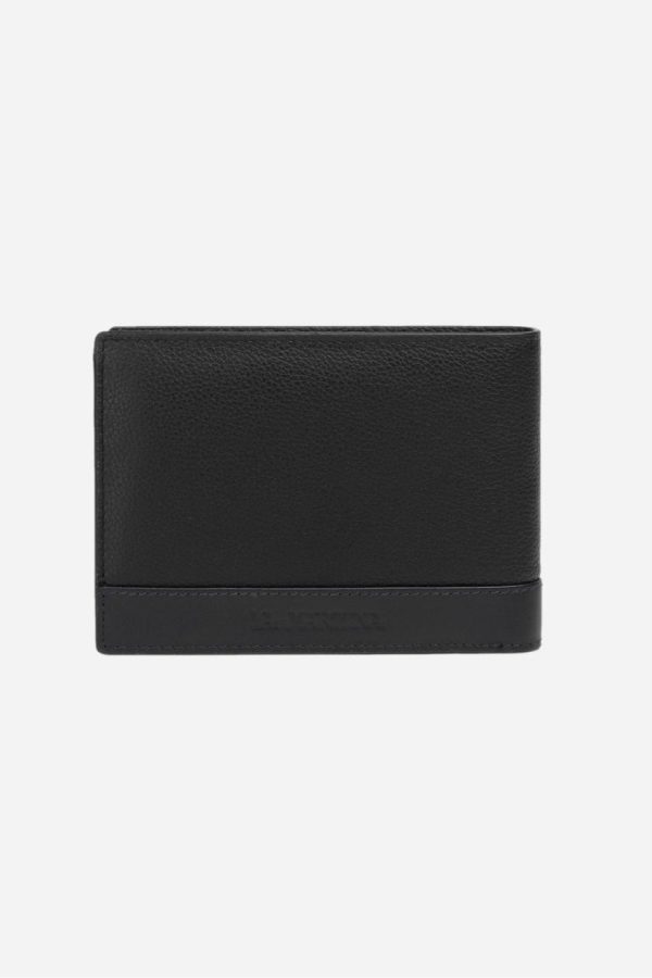 Men’s leather wallet. The brand logo is hot stamped directly onto the leather. Twelve internal card compartments and two note compartments.
