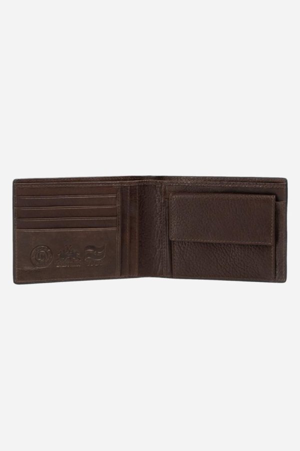 Men’s wallet in single-colour calfskin. The La Martina lettering is printed on the front. Inside there are nine compartments for cards, a compartment for banknotes, and a coin purse. Wallet dimensions: cm (width x depth x height) 13 x 9.50 x 1.50.