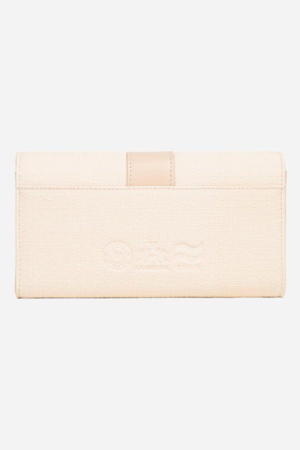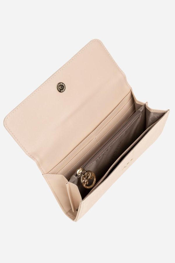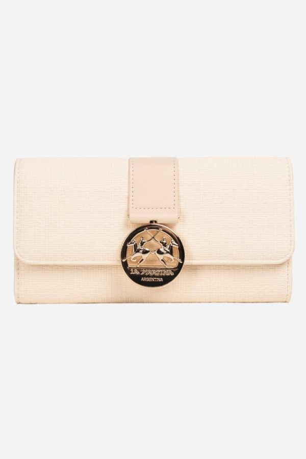 Women’s wallet in a single colour, made of polyurethane. Magnetic button fastening. Inside there are 14 card compartments, two open compartments ideal for banknotes and one zipped compartment ideal for coins. The institutional logo is represented by a large metal plate on the front. Dimensions (length x height x width) 19 x 10 x 2 cm.