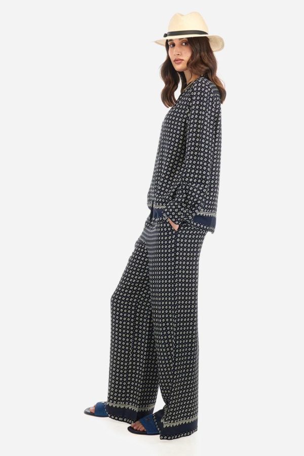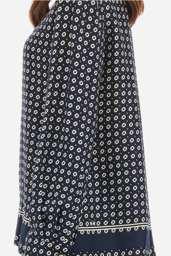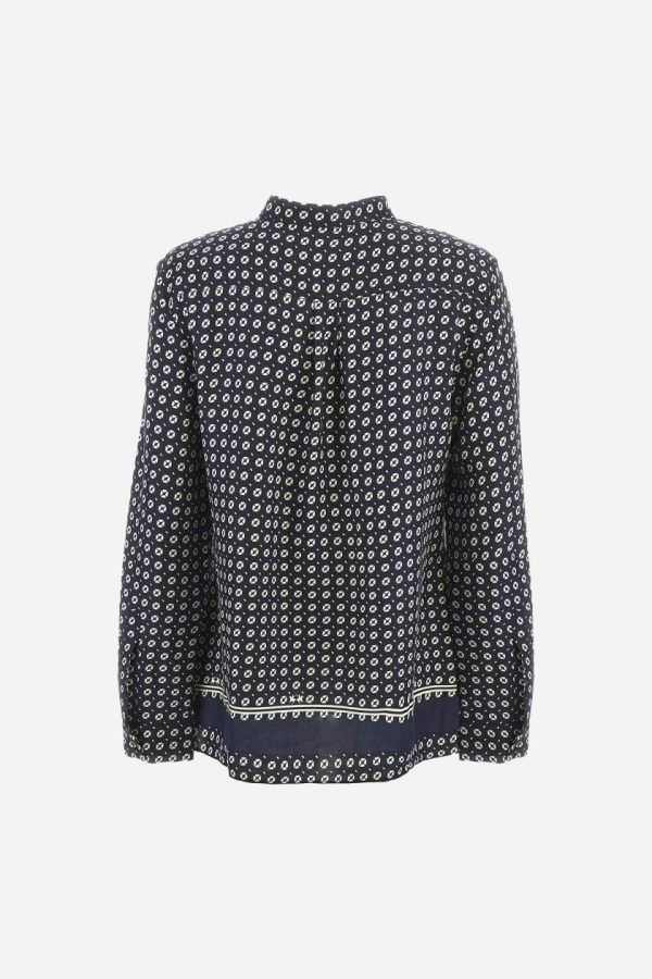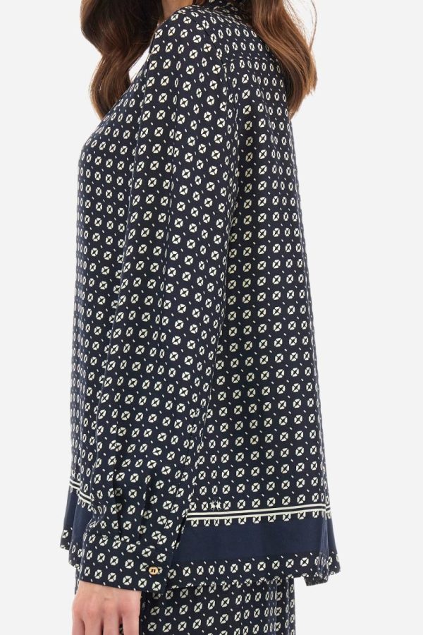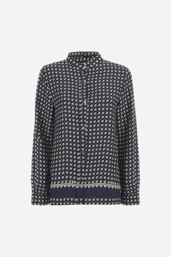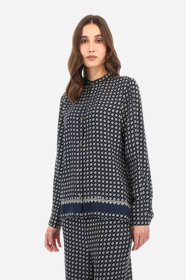 Discover our women’s premium long-sleeved shirt featuring an exclusive geometric print design. Made in viscose twill for exceptional comfort and drape. Showcasing a distinctive banded motif at the hem and sophisticated mandarin collar. Features custom gold metal buttons for added elegance. The logo is present within the print. The fit is regular, with dropped shoulders and hip length for contemporary comfort. The model is wearing a size 40.