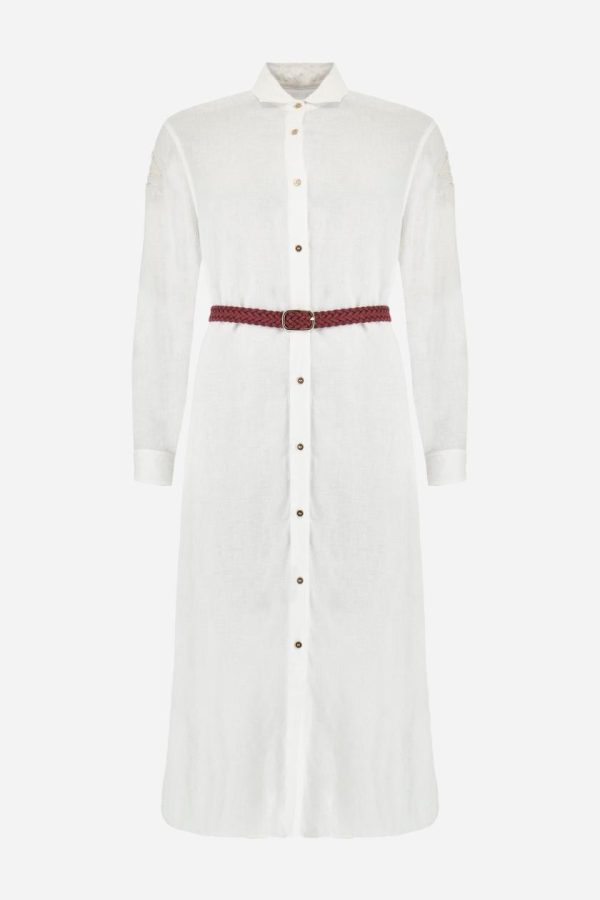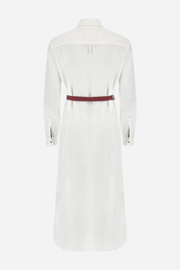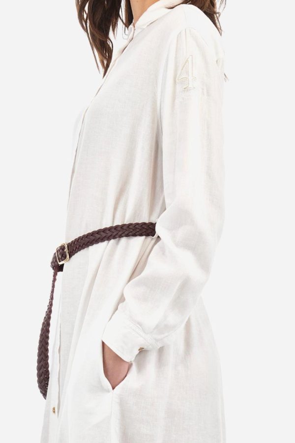 Discover this stunning long-sleeved dress in a pristine single color, crafted from premium linen and viscose canvas blend. Featuring a flattering midi length, sophisticated French collar, and secure closure with custom gold metal buttons. Practical double side pockets add functionality to this elegant piece. Complete with a stylish braided eco-leather belt that threads through the waistline belt loops for adjustable fit. The left sleeve showcases an embroidered number 4 patch in matching gabardine with contrasting metallic thread detailing, complemented by subtle La Martina lettering embroidered below. The brand logo is elegantly displayed on the metal plate beneath the right pocket. Designed with a comfortable regular fit that flatters every figure. The model is wearing a size 2.