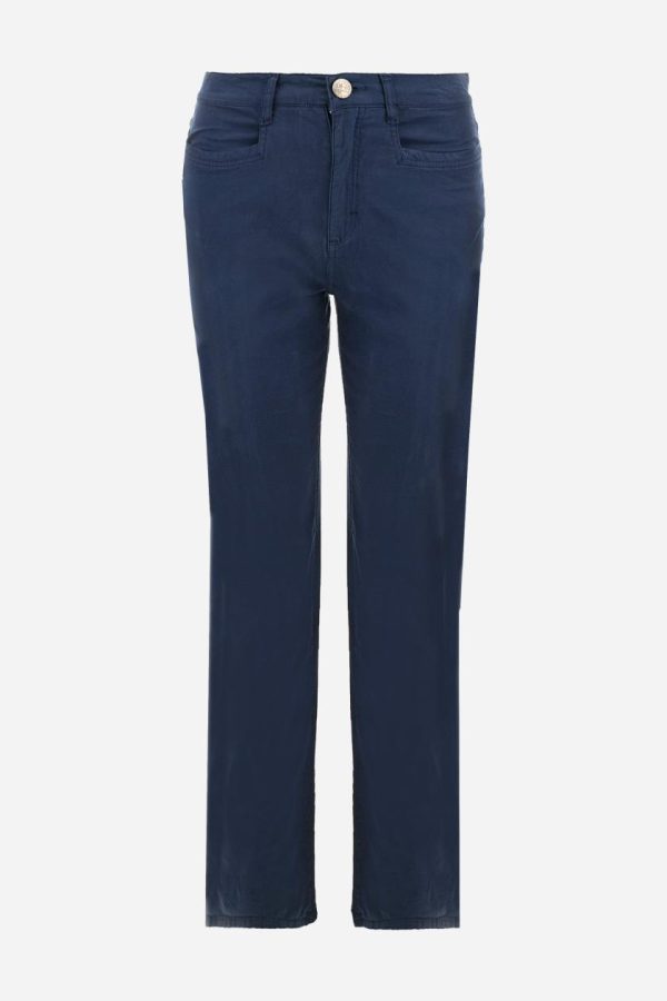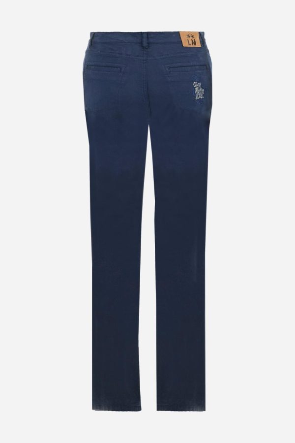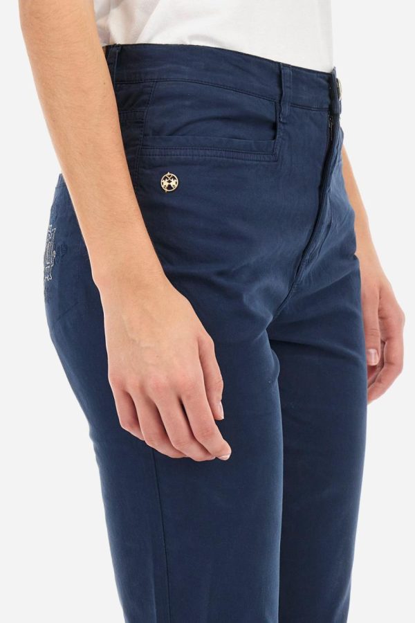 Elevate your wardrobe with these stunning women’s flared trousers in rich cotton twill. Features a secure zip and metal button closure with versatile five-pocket design. The square front pockets and adjustable strap with belt loops offer both style and functionality. Back pockets showcase horizontal welt openings with decorative stitching that mimics classic denim detailing. The right pocket boasts beautiful embroidery in contrasting thread, while the eco-suede backstrap adds luxury with hot stamping. Designed for comfort with a regular fit that moves with you. The model wears a size 26.
