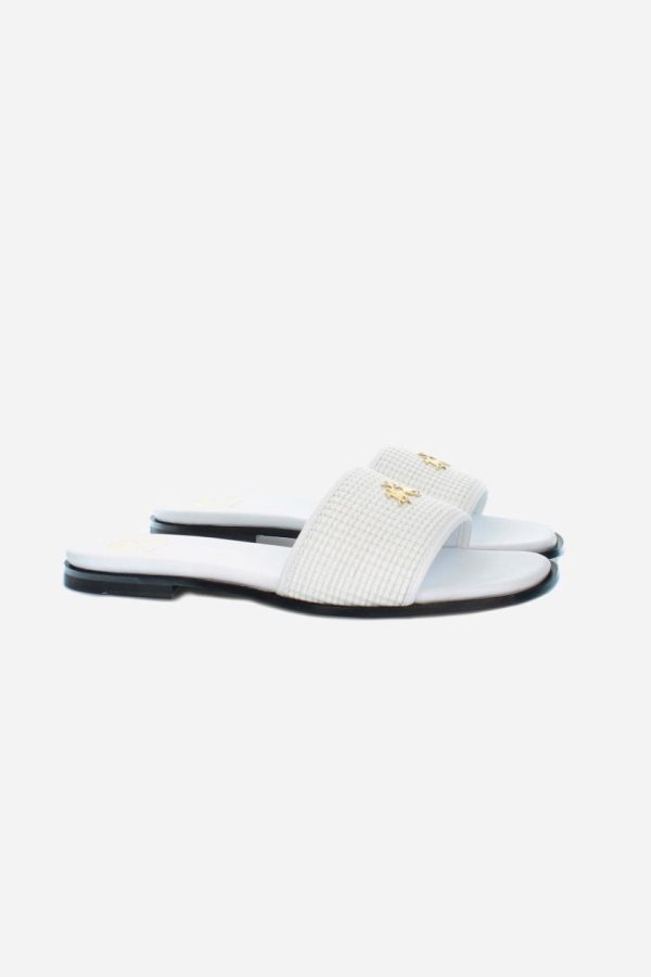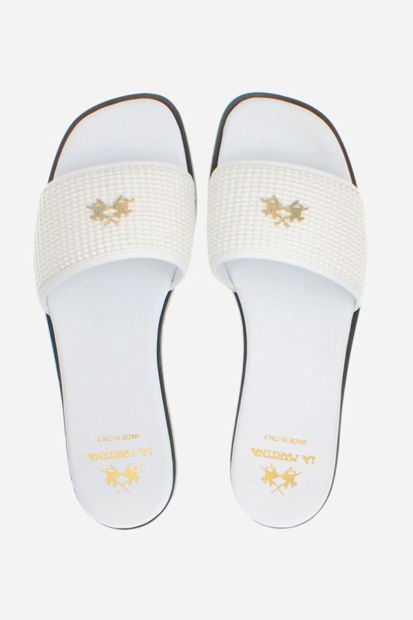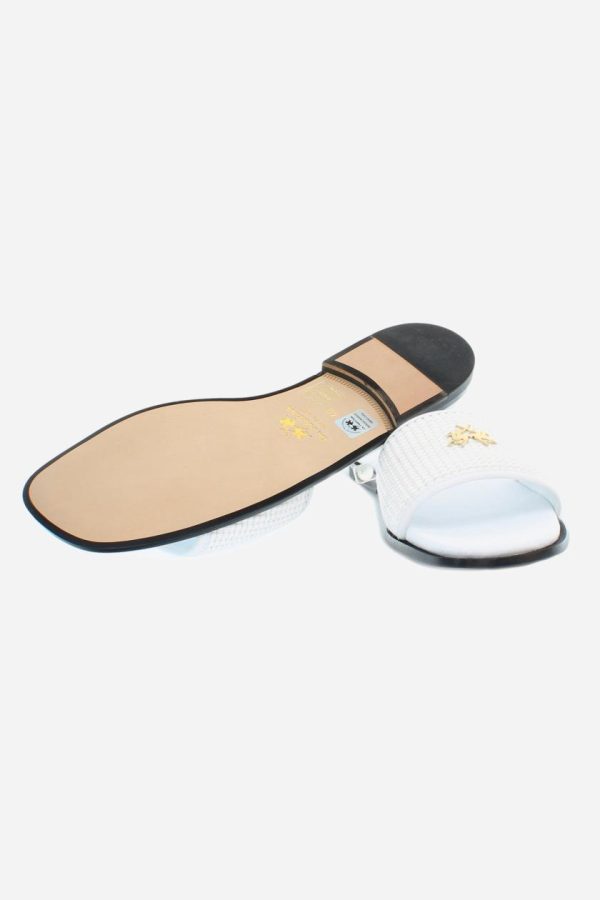 Elevate your summer wardrobe with these premium women’s sandals crafted from genuine leather. Available in versatile white and denim-inspired finishes, these sandals feature elegant gold-tone hardware with the signature La Martina logo for a touch of luxury. The leather sole offers comfortable support with a subtle heel lift, while the contoured footbed ensures personalized comfort throughout the day. Perfect for creating stylish, refined looks that transition effortlessly from day to evening.