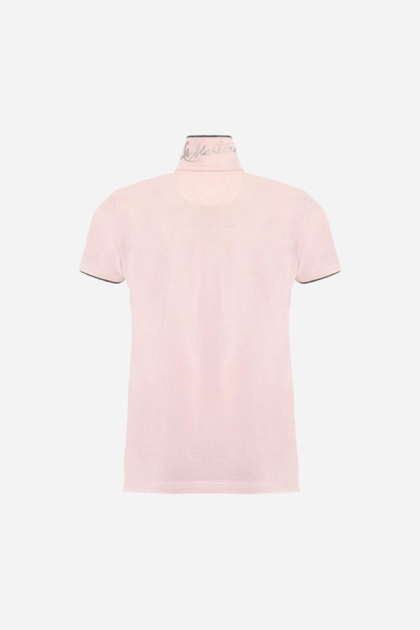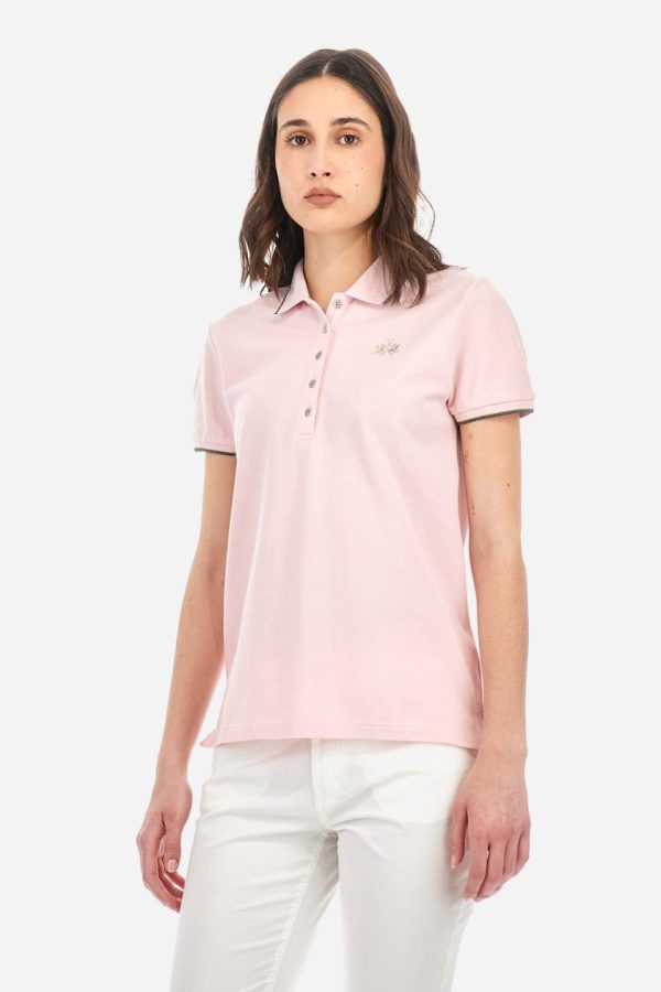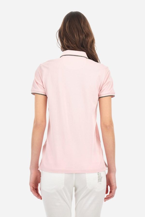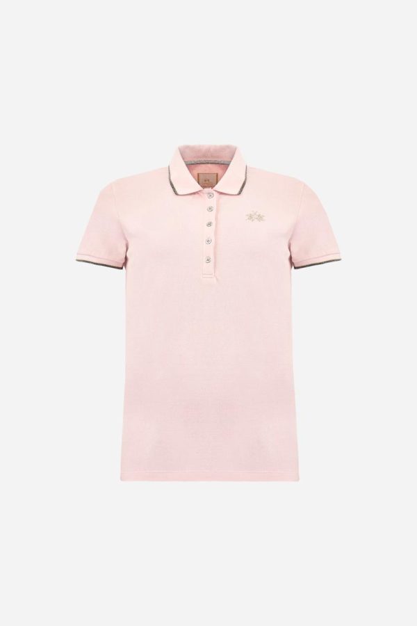 Elevate your wardrobe with this women’s short-sleeved polo shirt featuring a timeless single-color design. Expertly crafted from stretch pique fabric with a five-button closure. The matching ribbed collar and cuffs are enhanced with elegant lurex trim, while a sophisticated silver lurex grosgrain ribbon adds luxury inside the collar. Showcase the signature logo embroidered in premium lurex thread on the left chest, complemented by exclusive La Martina glitter print lettering under the collar. Designed with a comfortable regular fit that flatters every figure. The model is wearing a size 2.